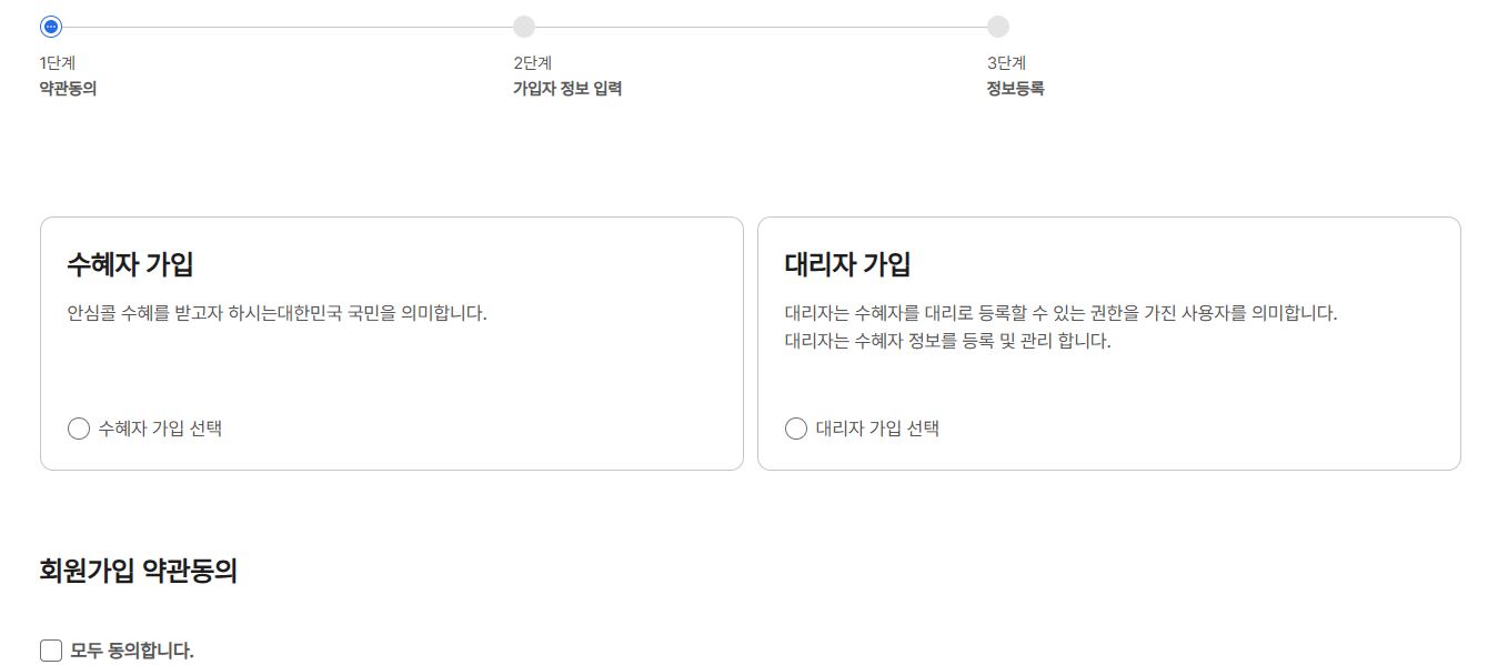 일단 수혜자 가입으로 진행해봤습니다. 캡챠 인증후 휴대폰본인증이 있습니다. 로봇이 아닙니다를 눌러주세요.