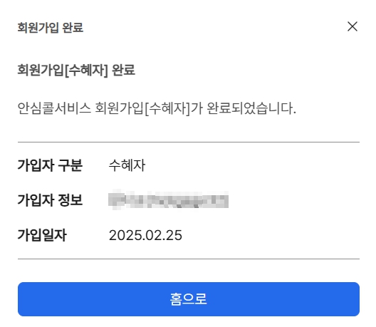 회원가입 안료라는 팝업창이 뜨면 서비스 가입이 완료된건데요. 로그인하면 서비스 가입 상태로 뜹니다.