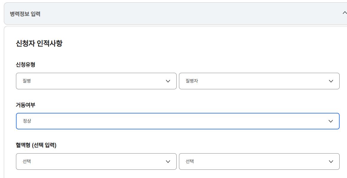 아이디 생성후, 주소입력을 하고 신청유형에는 질병과 질병외가있습니다. 평소 앓고 있는 질병, 과거 수술병력도 입력합니다. 거동여부 체크하시고, 혈액형은 선택입력입니다.