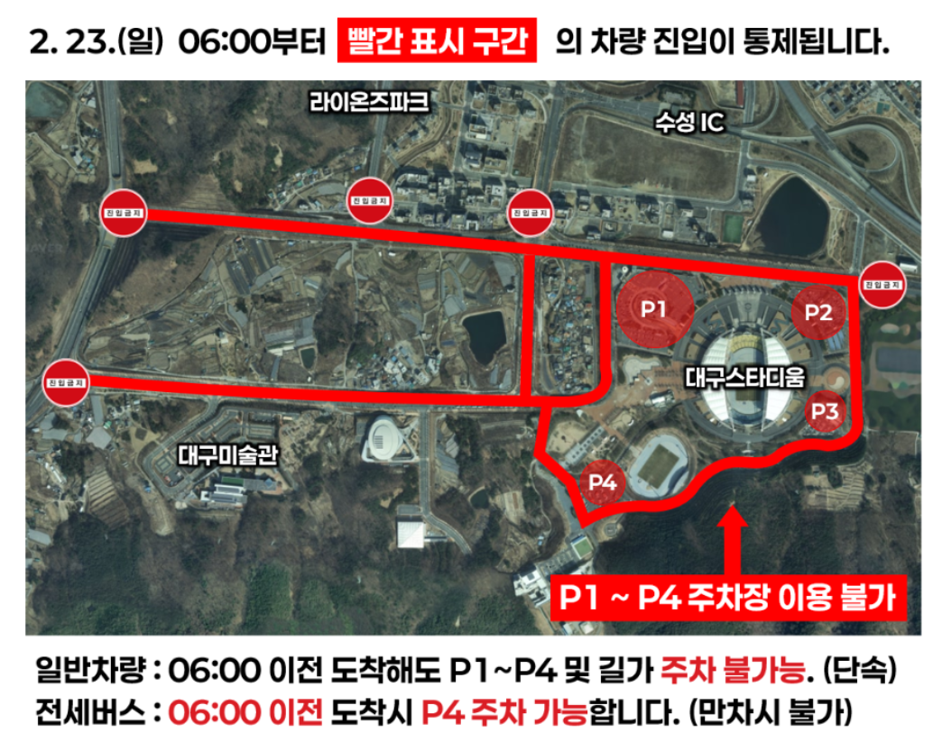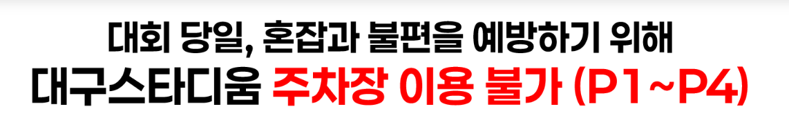 대회 당일, 대구스타디움 주변과 수성구, 동구, 중구 일대에서는 교통 통제가 예정되어 있습니다. 특히, 스타디움 주변은 오전 6시부터 오후 4시까지, 수성구·중구·동구 일대는 오전 8시 30분부터 오후 4시까지 통제가 되는데요.