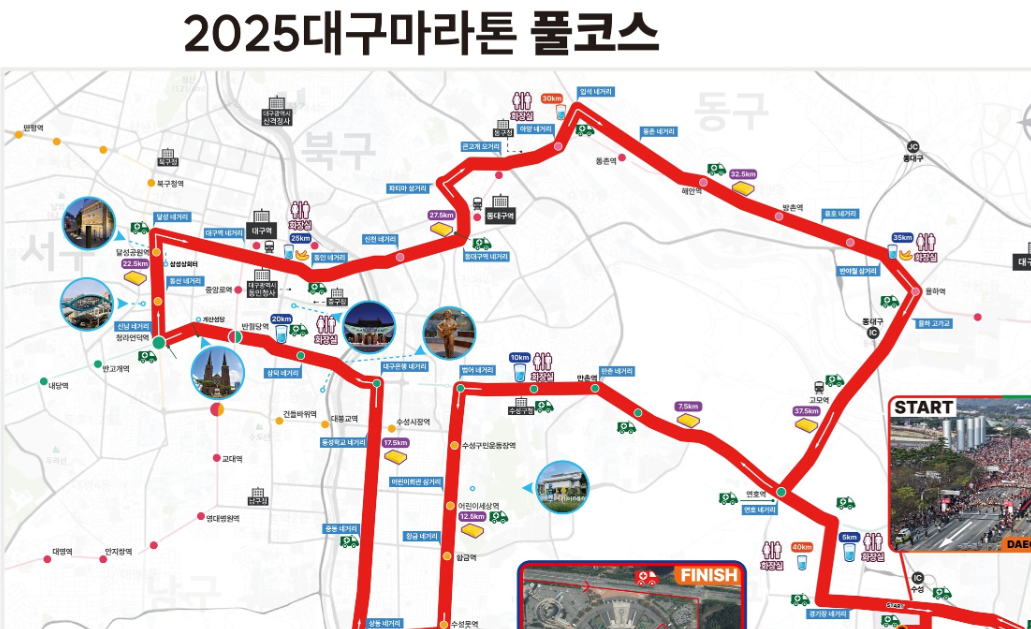 코스 정보: 풀코스는 대구 시내를 순환하는 형태로, 일부 구간에 업힐이 포함되어 있어 도전 욕구를 자극합니다.